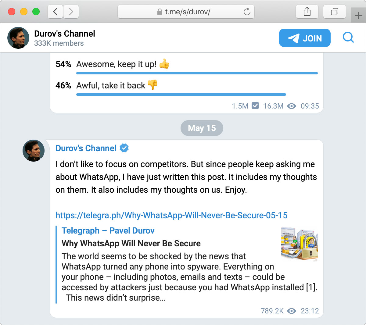 Kanallardan bahsetmişken, artık Telegram'da oturum açmamış olsanız bile, web'deki herhangi bir genel kanalı görüntüleyebilirsiniz. Aynı şey, Telegram hesabı olmayan retro insanlar için de geçerlidir. (Evet, hâlâ böyle birileri var.)