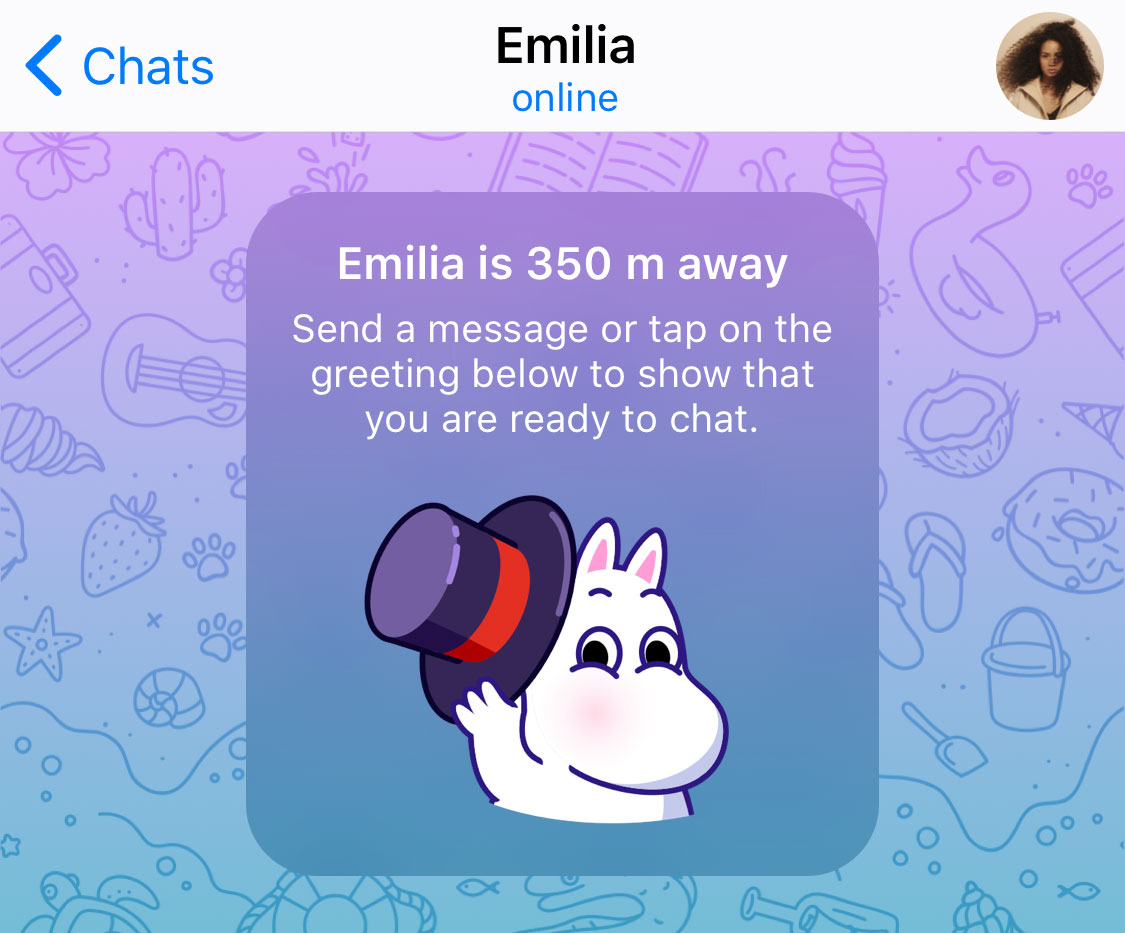 هنگامی که گفتگوی جدیدی را از طریق صفحه افراد نزدیک باز کنید، تلگرام برای شکستن یخ شما یک استیکر احوالپرسی پیشنهاد میدهد. و هنگامی که دیگران با استفاده از این قسمت با شما ارتباط برقرار کنند، میتوانید ببینید که آنها چقدر از شما دور هستند.