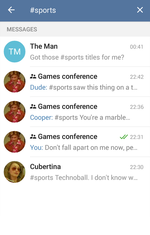 Another new way of bringing structure to group chats is by using hashtags. Any word starting with a “#” will be clickable. Tap on a hashtag to get instant search results from your Telegram messages.