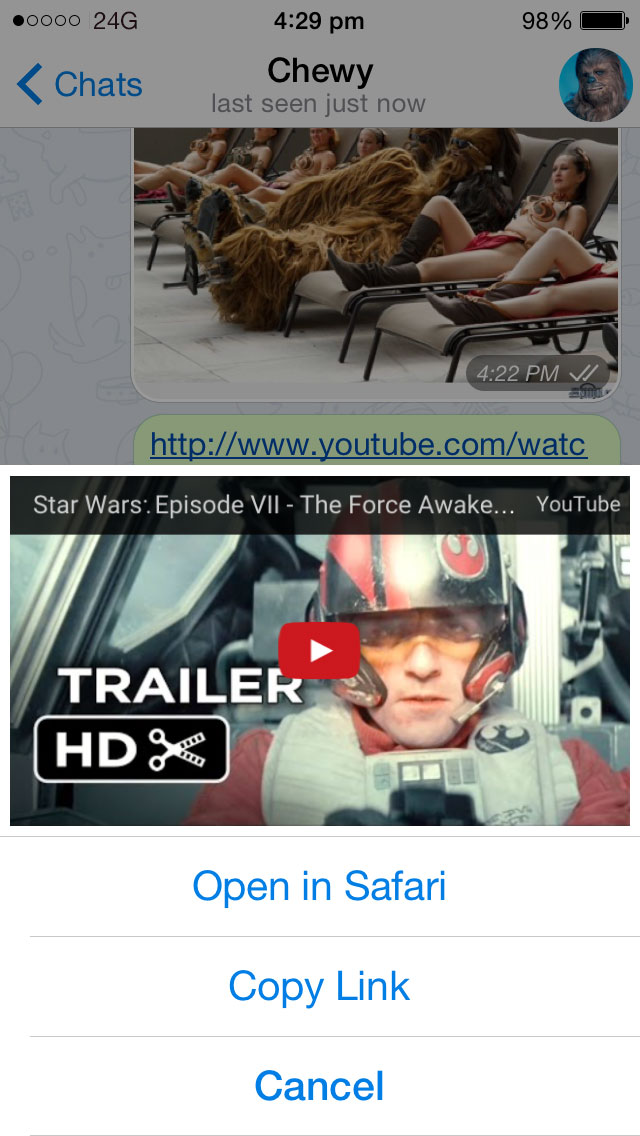 The new version of Telegram allows you to play media from services like YouTube, Vimeo or SoundCloud directly from Telegram – without having to leave the app. Just tap on the preview of a link to an external media to view the video or listen to the audio file (speaking of audio files, they are now beautifully rendered and played in chats).