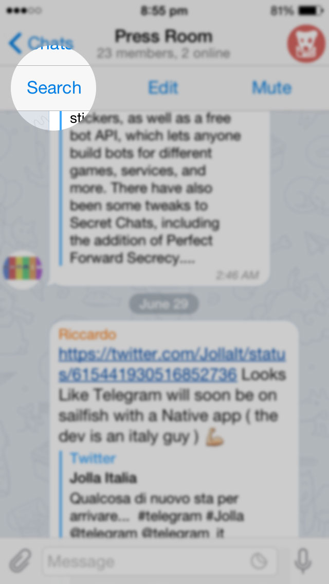All of your communications in Telegram are already instantly searchable with the multi-purpose search field, but now you can also search for messages in specific chats. Just tap on the name of the chat in iOS or toggle the Actions menu in Android: