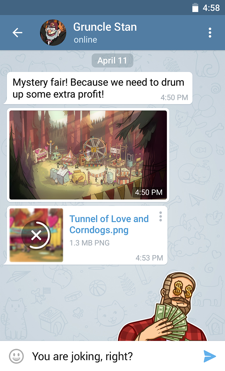 The Android app received a major tuneup in the design department. We've redesigned the chat screen, optimized the colors, reimagined buttons and message bubbles, created beautiful progress bars, fully revamped documents and other attachments.