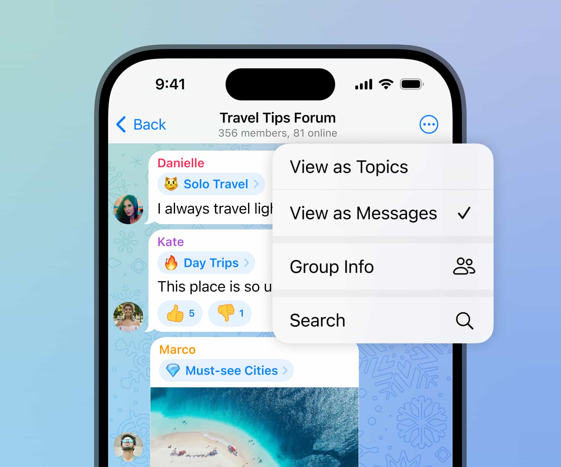 Em grupos com Tópicos ativados, seu aplicativo salvará sua preferência de visualização, como Ver como Mensagens ou Ver como Tópicos quando você abrir o grupo novamente.