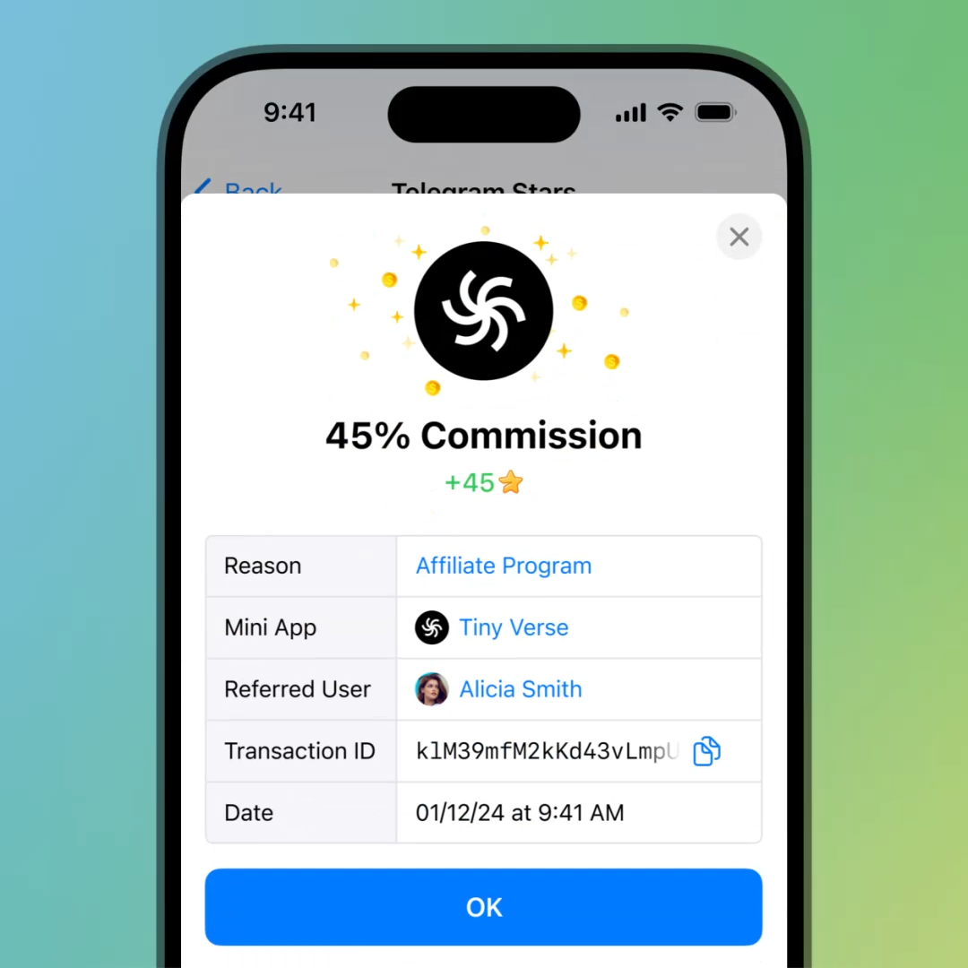 Gli sviluppatori possono aprire programmi di affiliazione per la loro mini app, permettendo ai creatori di contenuti, ad altri sviluppatori di mini app e a qualsiasi utente di Telegram di promuoverla e guadagnare commissioni sugli acquisti effettuati dalle persone che hanno invitato.
