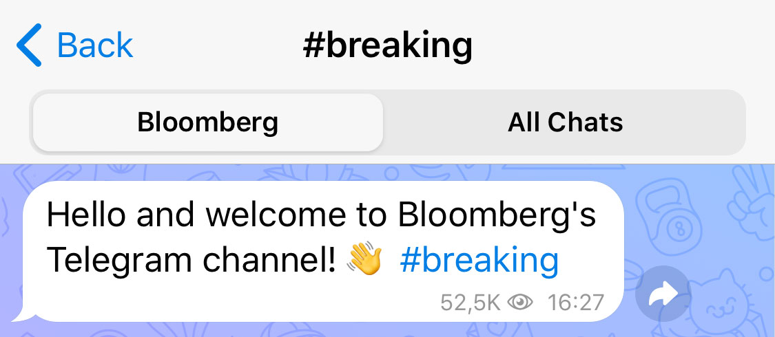 Telegram supports hashtags – tapping on a hashtag in a message will show a search interface with all other tagged posts in the channel. This is useful for adding a layer of navigation for your channel and improving visibility of your older posts.