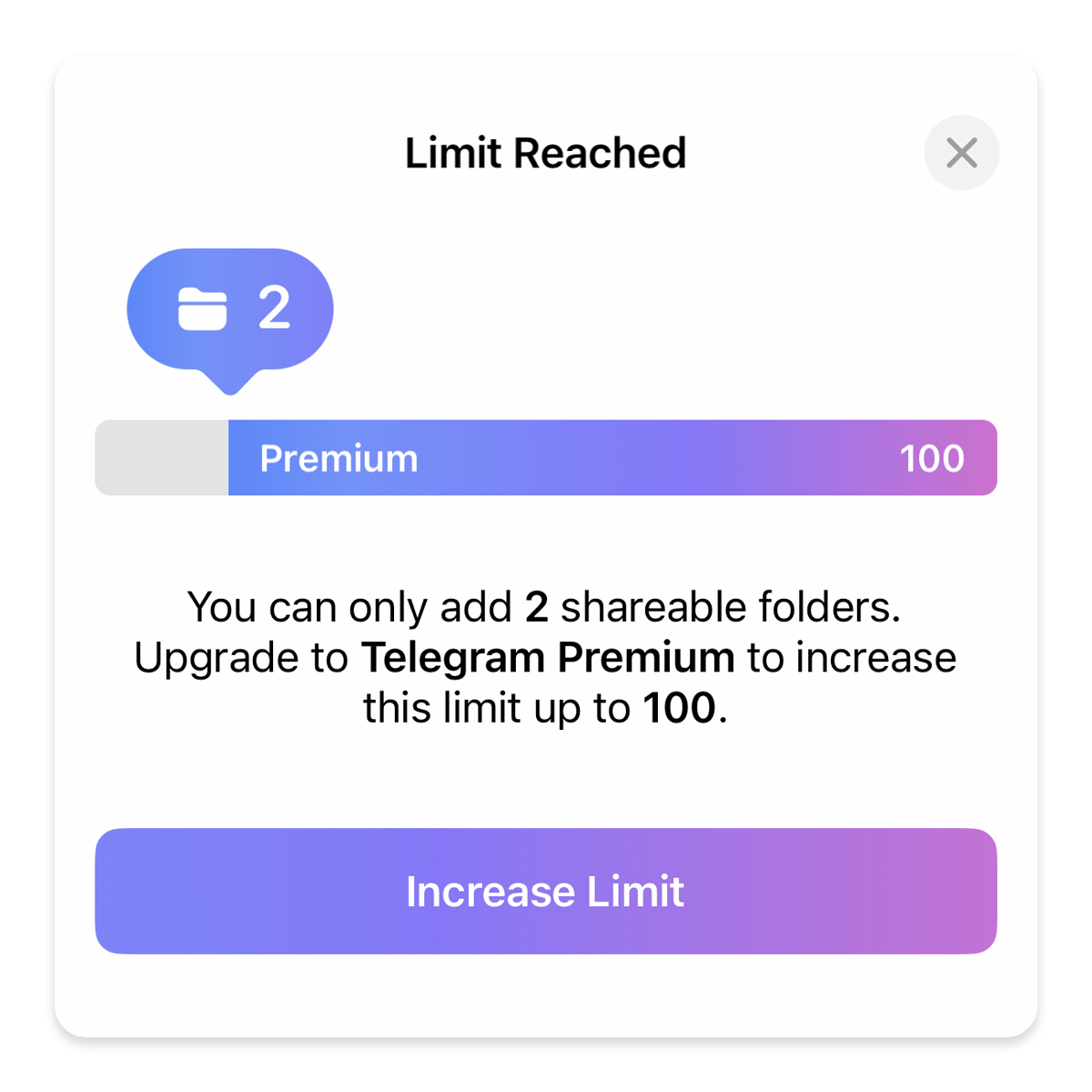 Tutti gli utenti Telegram possono aggiungere 2 cartelle condivisibili, ciascuna contenente fino a 100 chat, per unirsi ai colleghi o condividere interessi con gli amici. Gli abbonati a Telegram Premium sbloccano 20 cartelle condivisibili con un massimo di 200 chat ciascuna e possono creare fino a 100 diversi link d'invito per cartella.