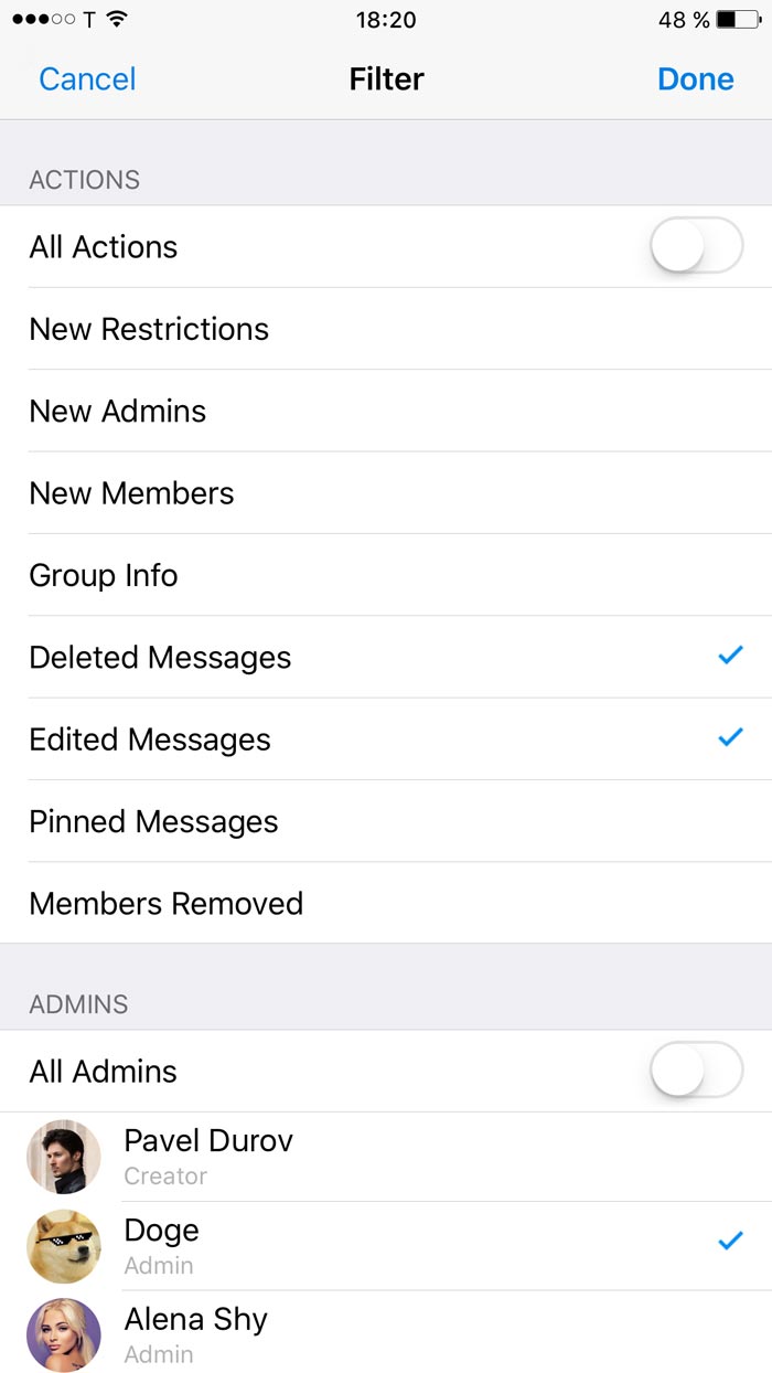 When multiple admins are working with one group, it’s easy to get confused about which admin did what and when (or which admin bot has gone Skynet on your members). That’s why we've added a “Recent Actions” section to the admins page. This section stores a log of all service actions taken in the group in the last 48 hours and is visible to admins only.