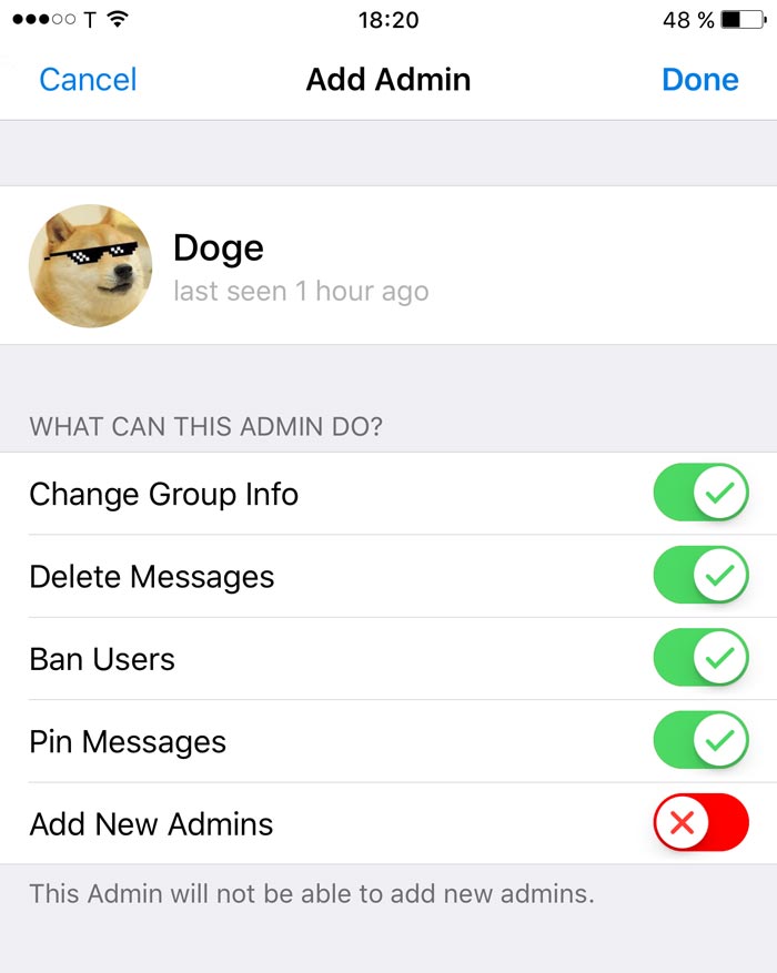 You can now add admins with specific sets of privileges to help you run your community. Choose who among your trusted admins will be able to add new users, manage messages, block members, edit group info, or even add new admins.