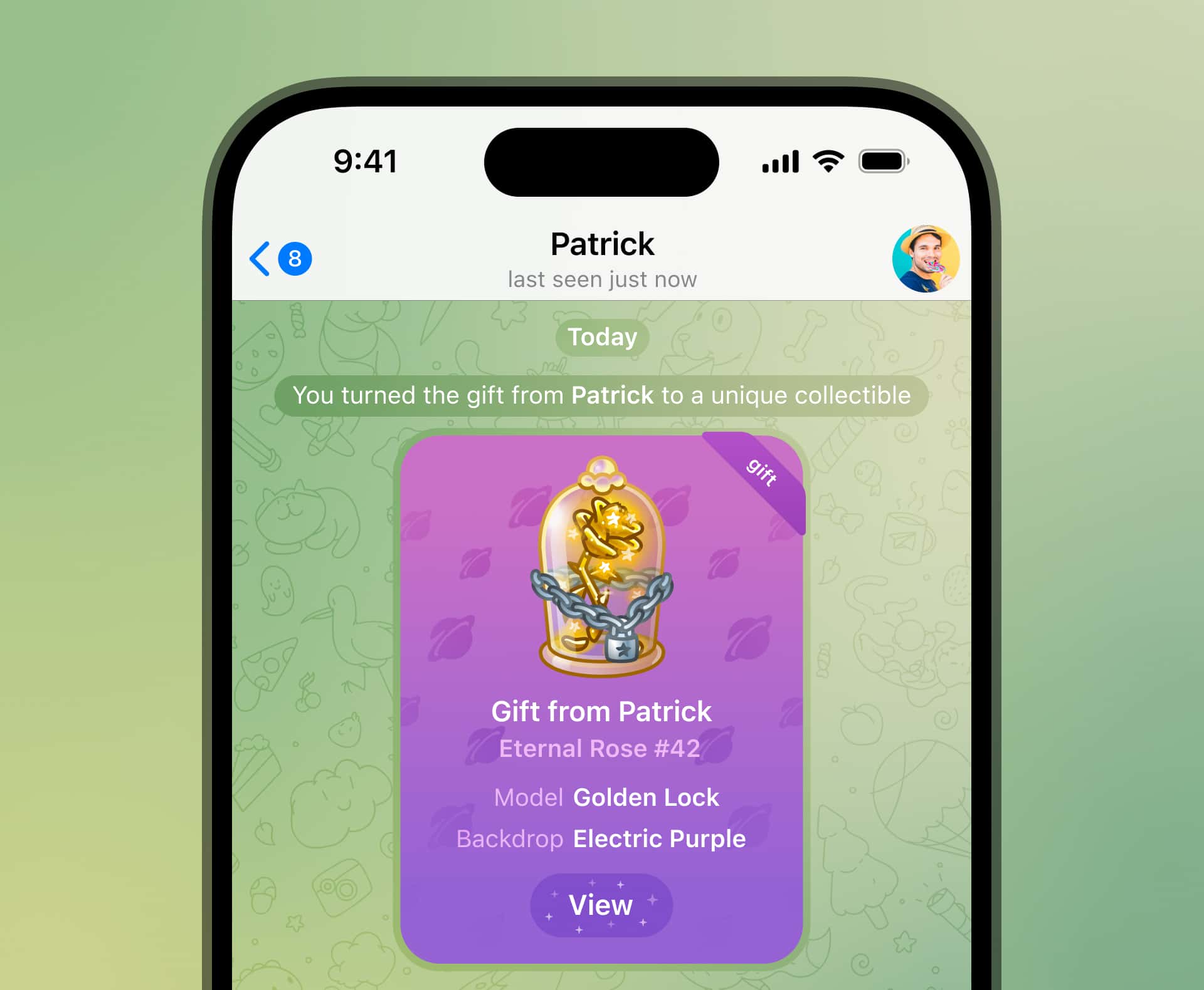 از این پس می‌توانید هدایایی که در تلگرام دریافت می‌کنید را به حالت کلکسیونی ارتقا دهید. هدایای کلکسیونی ویژگی‌های خاصی داشته و می‌توانند به کاربران دیگر منتقل یا در بازارهای NFT به حراج گذاشته شوند.