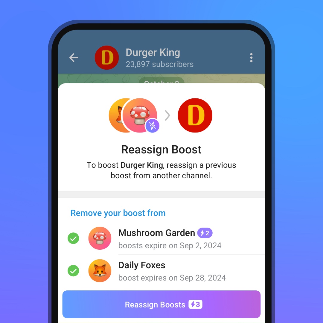 ابتداءً من اليوم؛ يحصل كل حساب تيليجرام مُميّز على المزيد من التعزيزات كجزءٍ من اشتراكهم. يمتلك المستخدمون الذين يدفعون لاشتراكهم بأنفسهم ٤ تعزيزات لتوزيعها على عدة قنوات، أو لإعطاء قنوات ما عدة تعزيزات.
