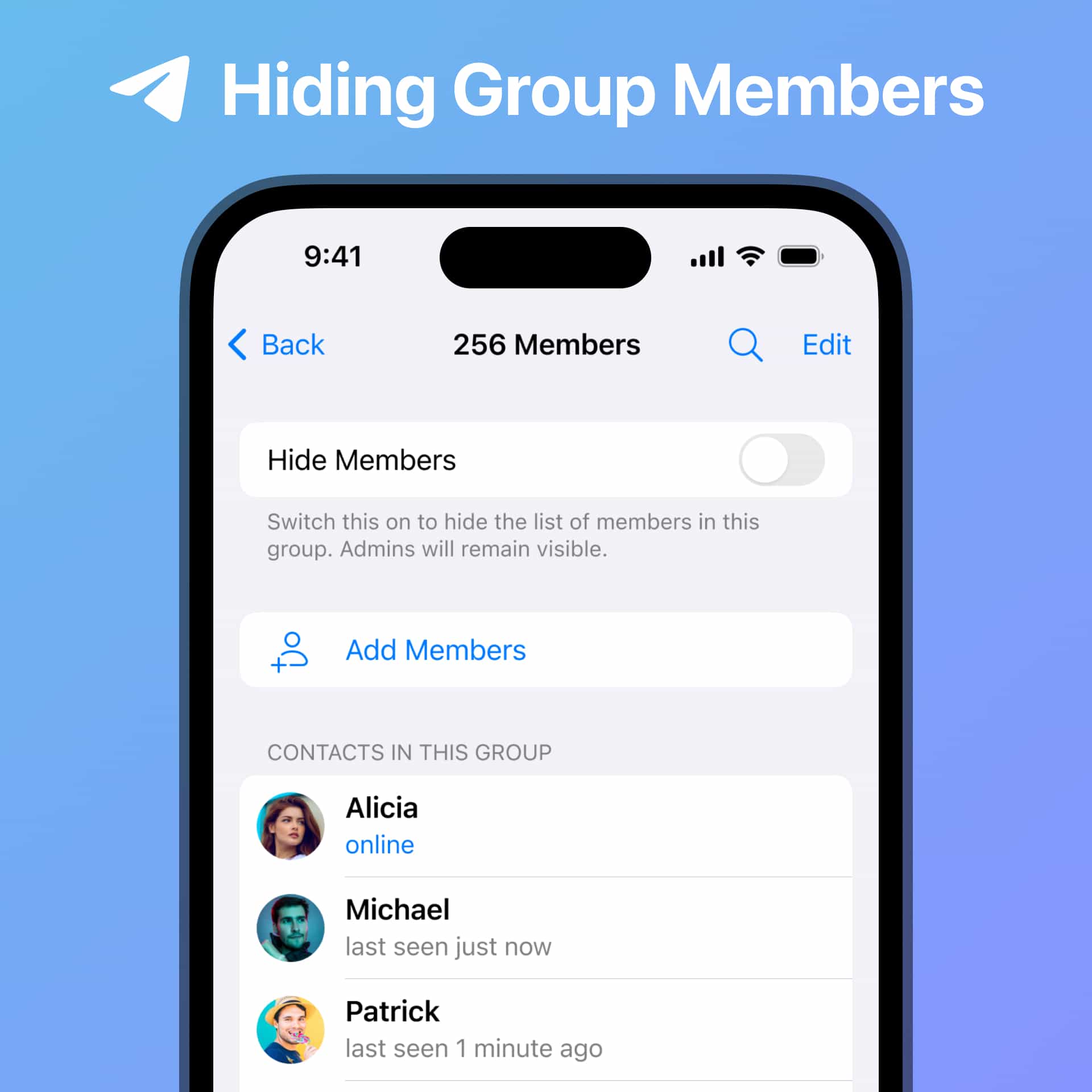 100명이 넘는 참가자가 있는 그룹의 관리자들은 참가자 목록 숨기기를 선택할 수 있습니다. 이렇게 하여, 사람들이 메시지를 안 보냈을 경우 관리자만 참가자 유무를 알 수 있게 됩니다.