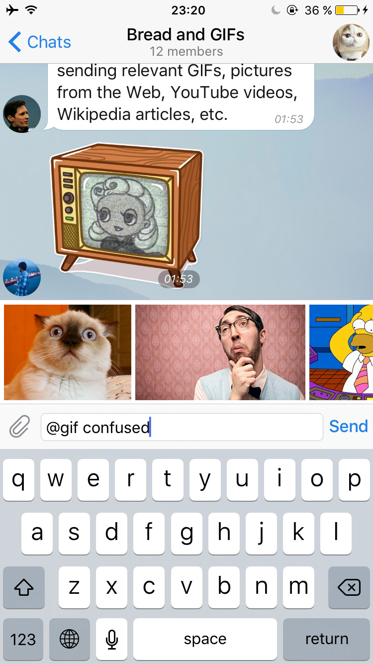 With the new inline mode, bots become omnipresent and can be used as a tool in any of your chats, groups or channels – it doesn't matter, whether the bot is a member or not. Inline bots can help you with dozens of different tasks, like quickly sending relevant GIFs, pictures from the Web, YouTube videos, Wikipedia articles, etc.
