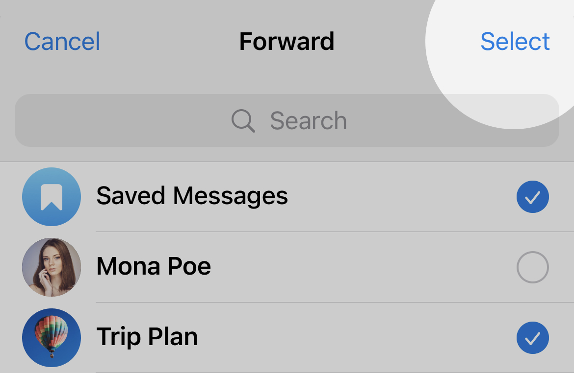 При пересиланні повідомлень можна натиснути на кнопку «Вибрати» і надіслати повідомлення відразу кільком адресатам — наприклад, швидко поділитися мемом з усіма друзями.